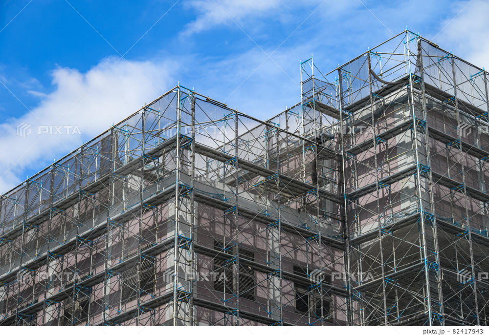 一般的に鋼鉄製の枠組み足場を設置し、人の手の届かない所での工事をサポートします。